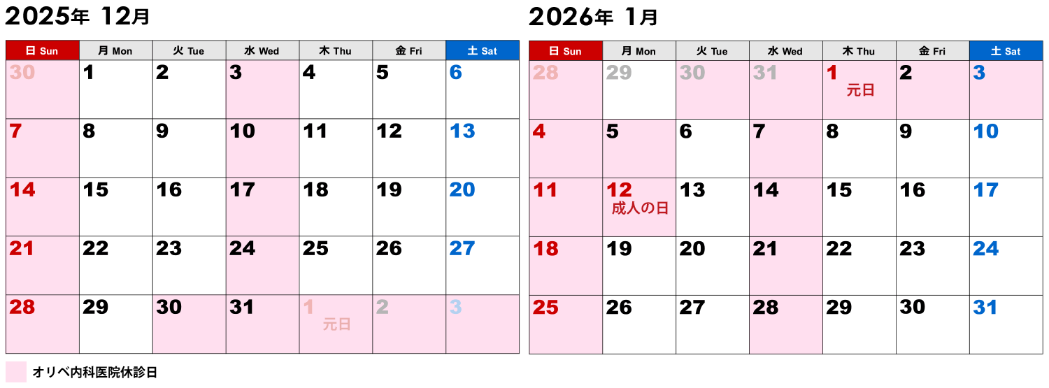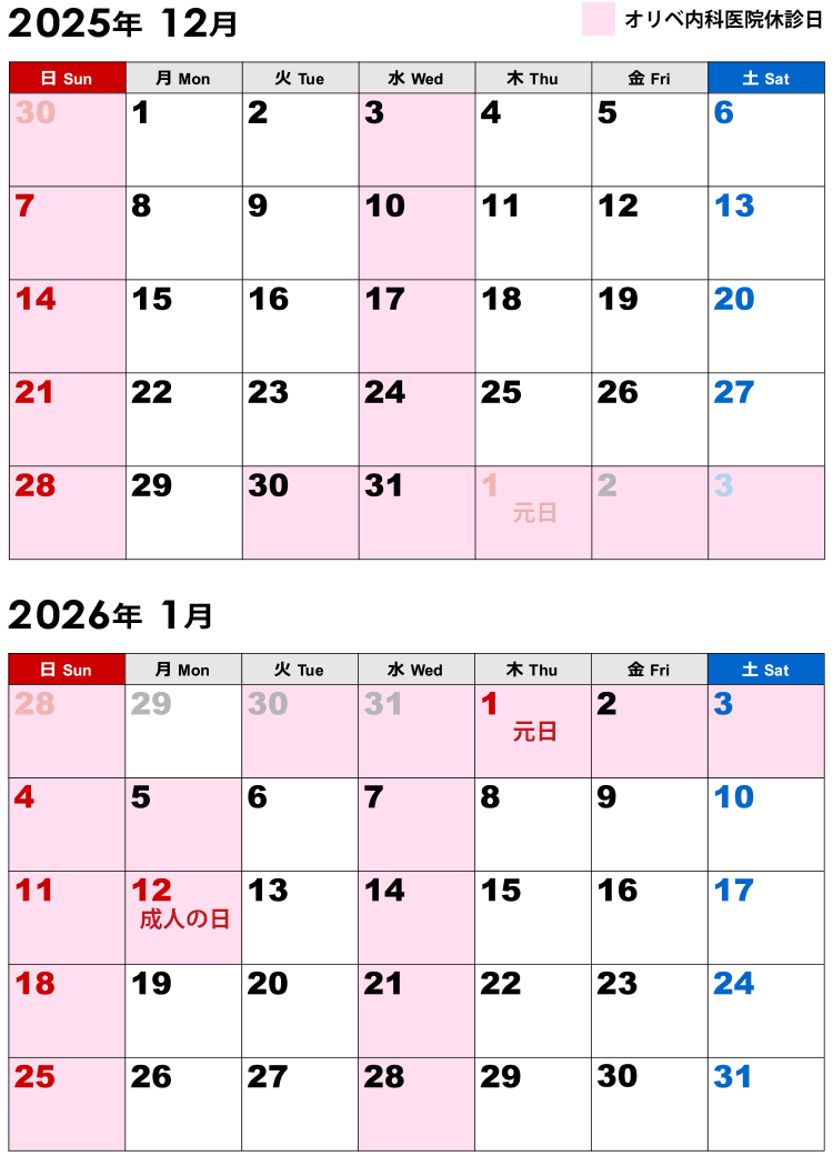 12月1日 年末年始の休診日について 投稿日時 19:50 by オリベ内科医院 年末年始の休診日は下記の通りとなります。 12月30日(火)~1月5日(月) … 休診日 年末は12/28まで、年始は1/6から通常通り診察いたします。 Print page 0 お気に入り